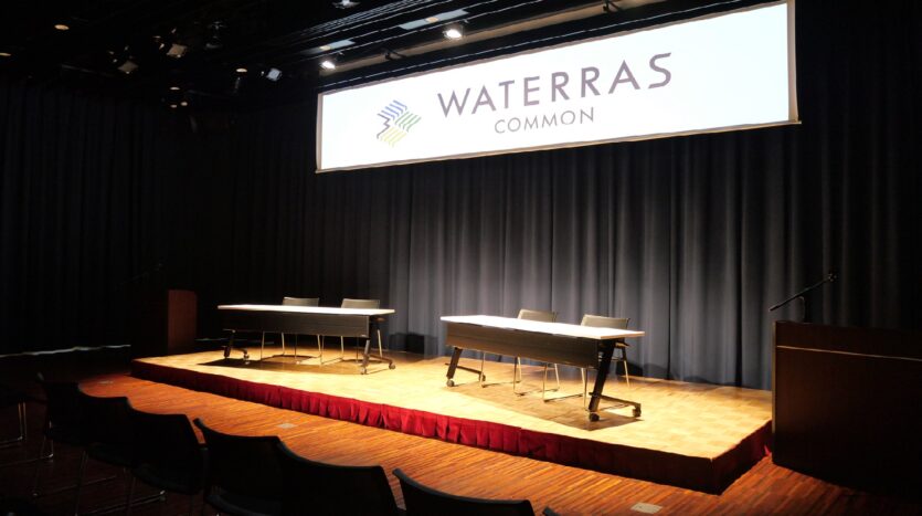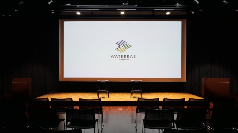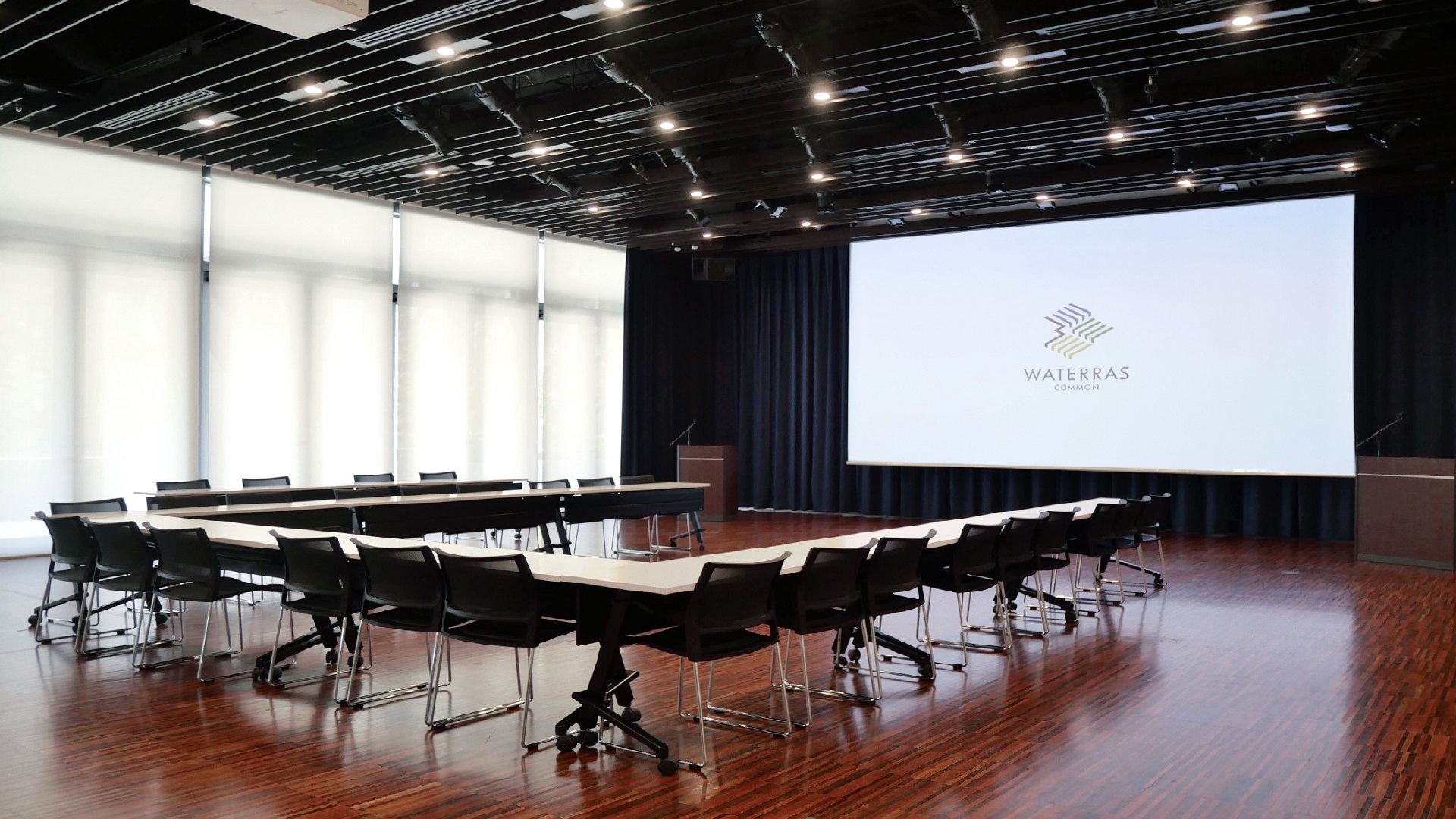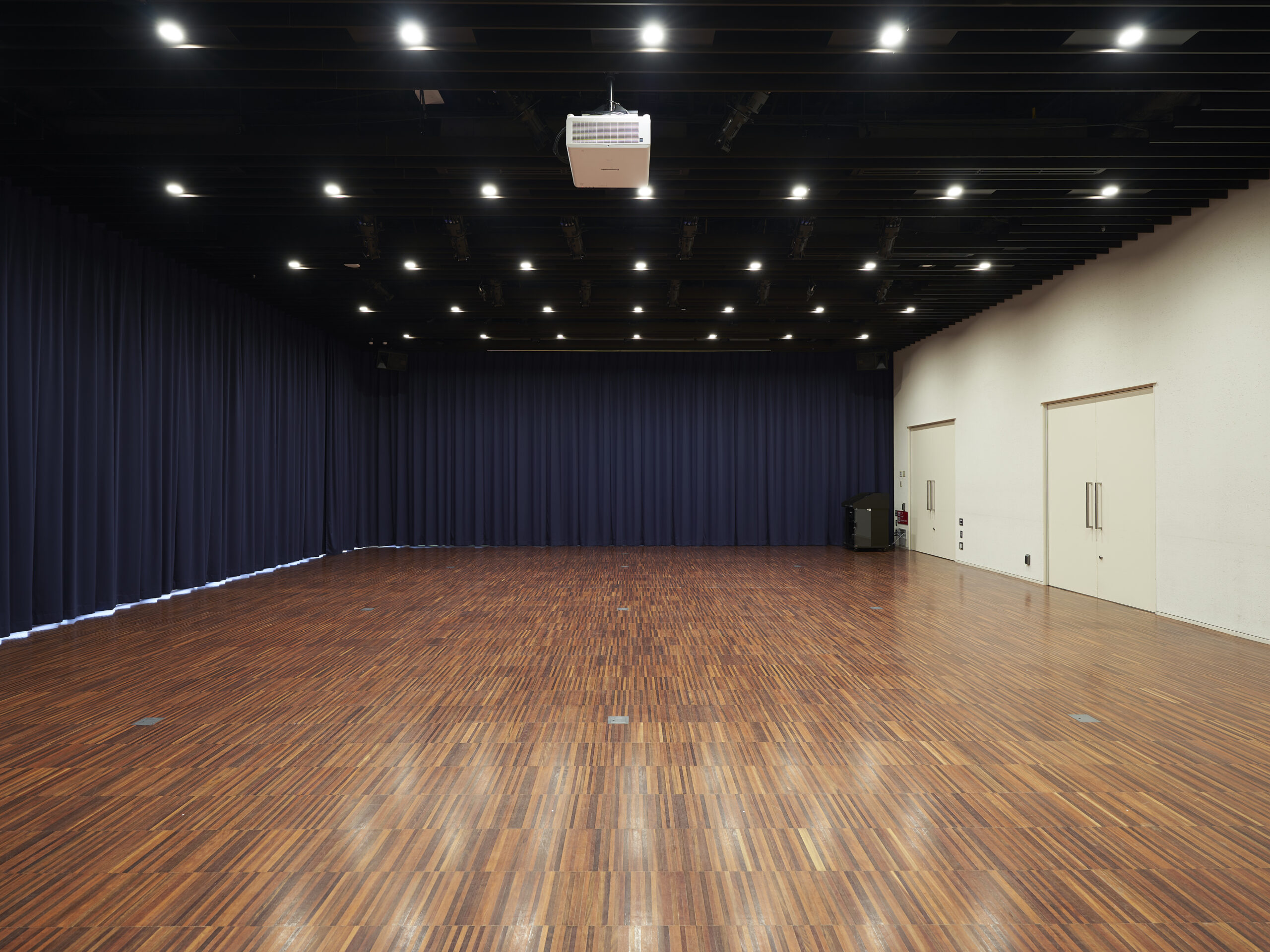 大窓2面に囲まれた開放的な空間。250インチの大型スクリーン、8000ルーメンのプロジェクター、音響・照明設備、ステージ、ピアノなどを備え、会議・セミナー利用から演奏会、ファンイベント、展示会など様々にお使い頂ける多目的スペースです。